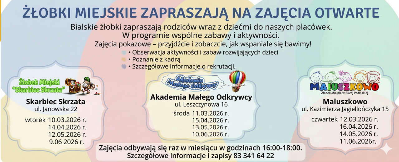Bialskie żłobki zapraszają rodziców wraz z dziećmi do naszych placówek. W programie wspólne zabawy i aktywności. Zajęcia pokazowe - przyjdźcie i zobaczcie, jak wspaniale się bawimy! Obserwacja aktywności i zabaw rozwijających dzieci Poznanie z kadrą oraz szczegółowe informacje o rekrutacji. Zajęcia odbywają się raz w miesiącu w godzinach 16.00-18.00 Szczegółowe informację oraz terminy poniżej. Zapisy na zajęcia pod numerem 83 341 64 22