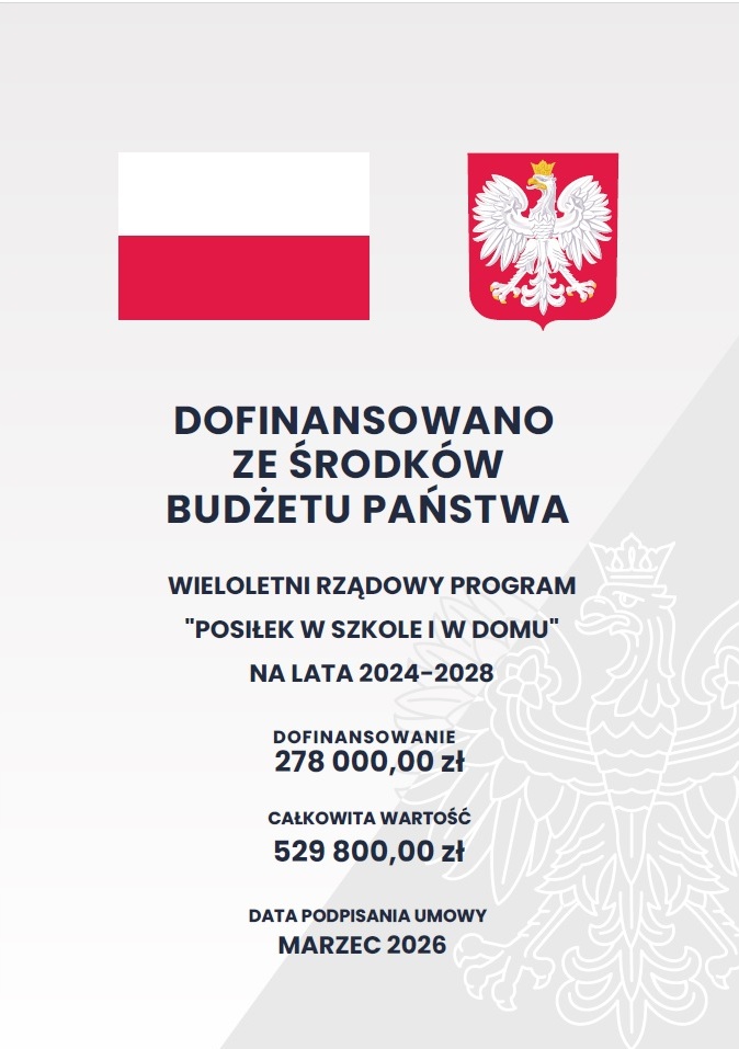 Program ten jest dofinansowany ze środków budżetu państwa na podstawie umowy nr 1078 zawartej w dniu 30 marca 2026 roku pomiędzy Wojewodą Lubelskim a Gminą Miejską Biała Podlaska. Środki z budżetu państwa przeznaczone są na dofinansowanie działań Gminy polegających na zapewnieniu pomocy w formie posiłku, świadczenia rzeczowego w postaci produktów żywnościowych lub świadczenia pieniężnego na zakup posiłku lub żywności osobom potrzebującym:
